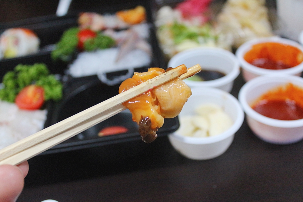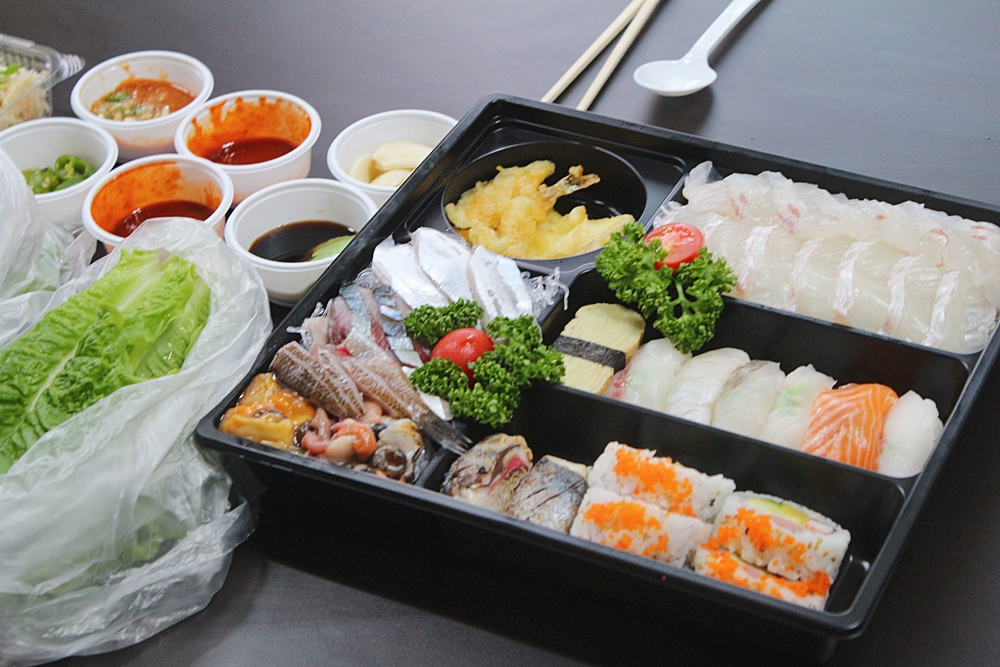 박스 하나에 회와 초밥 그리고 해산물들까지 다양하게 들어가 있어 굳이 횟집이 아니더라도 회를 푸짐하게 먹을 수 있게 나왔는데요. 스끼다시로는 튀김과 초밥, 해산물(소라, 개불, 멍게, 자리돔, 갈치)가 나와줬답니다.