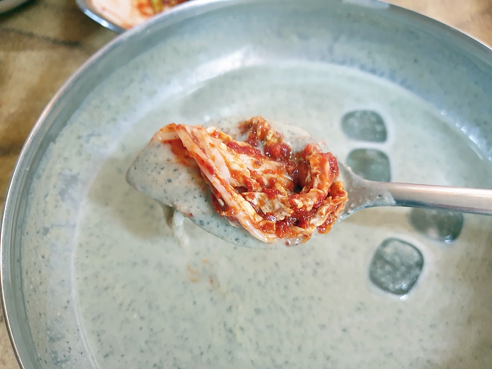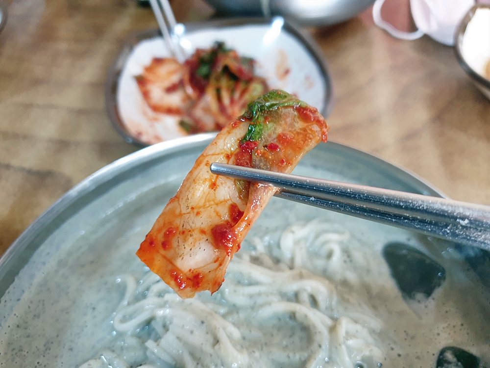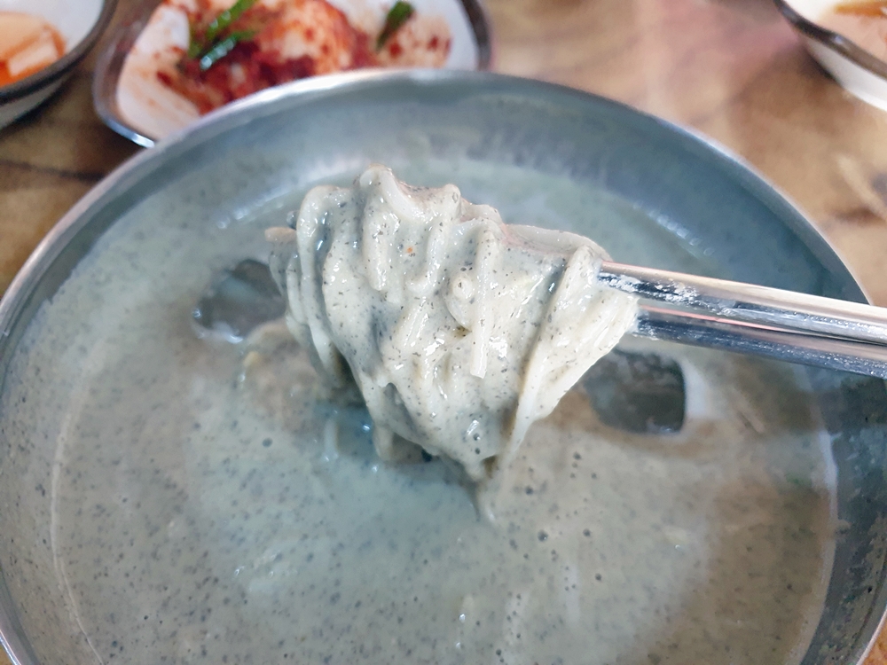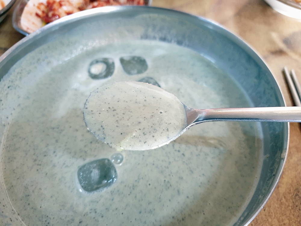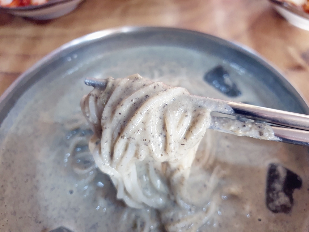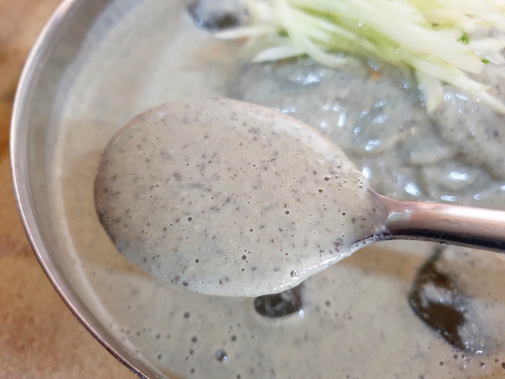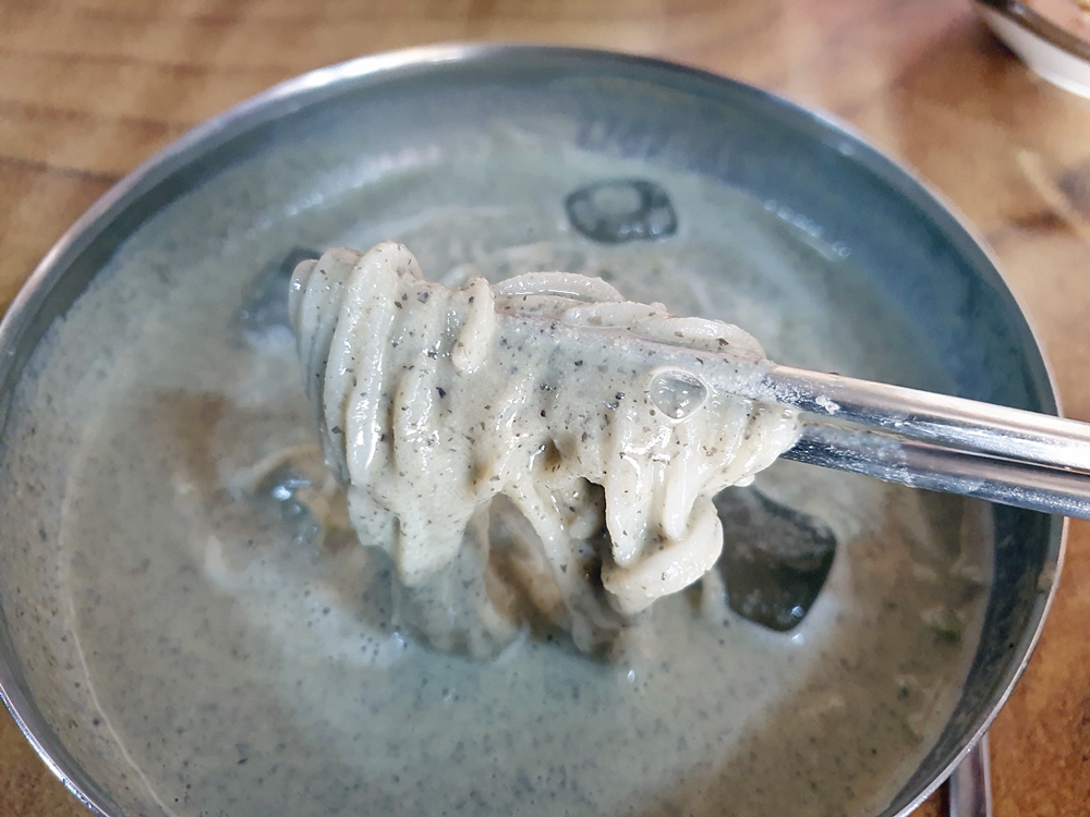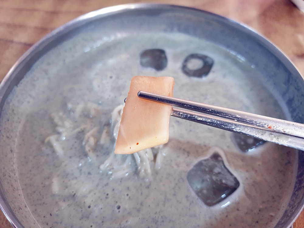 면은 차가운 육수에 담겨 있어 쫄깃한 탄력감이 아주 좋았는데요. 그리고 걸쭉한 콩국물이 면에 착 달라부터 고소함을 가득 느낄 수 있었네요.