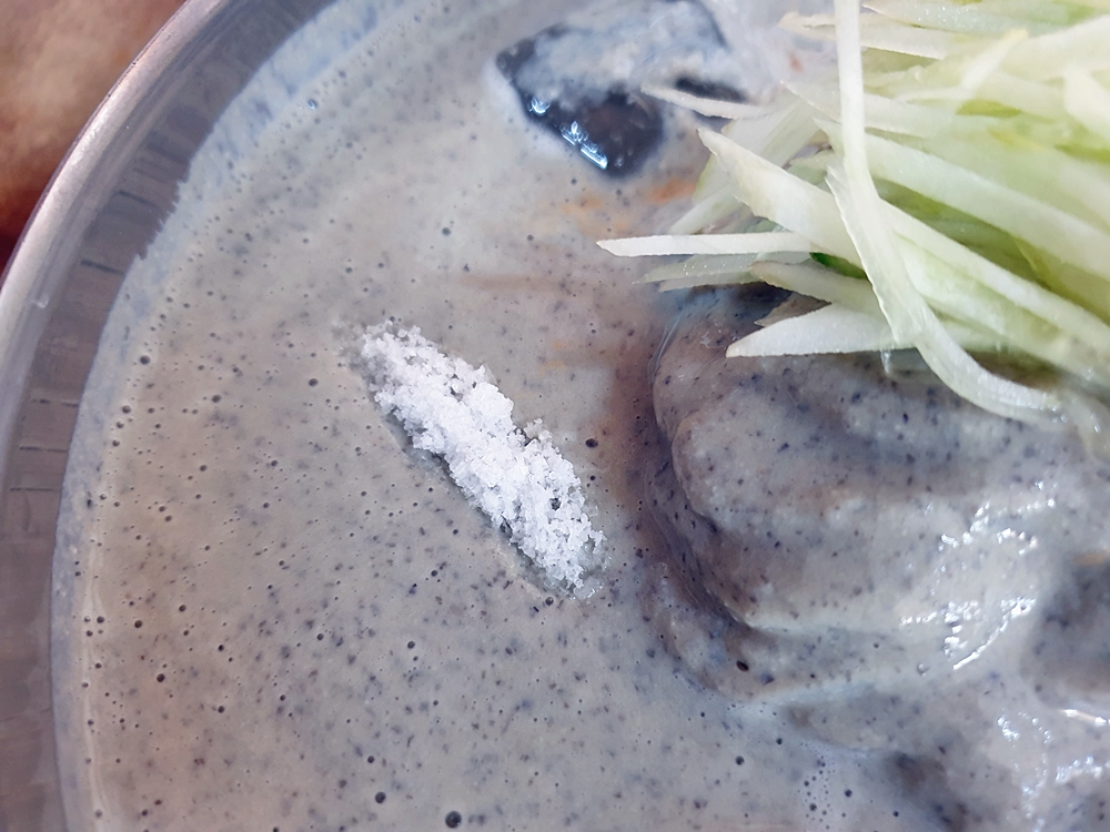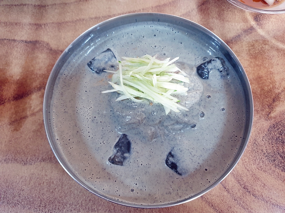잠시 기다리고 있으니 검은콩국수가 나와줬는데요. 아주 심플하게 육수와 그위로 고명이 오이가 올라간게 전부지만 이곳은 오랜시간 많은분들이 찾을 만큼 진한 콩국물의 맛이 아주 인상적이고 비린내가 나거나 목에 걸림이 전혀 없어 콩국수를 좋아하지 않는 분들에게도 인기가 좋은 곳이랍니다.