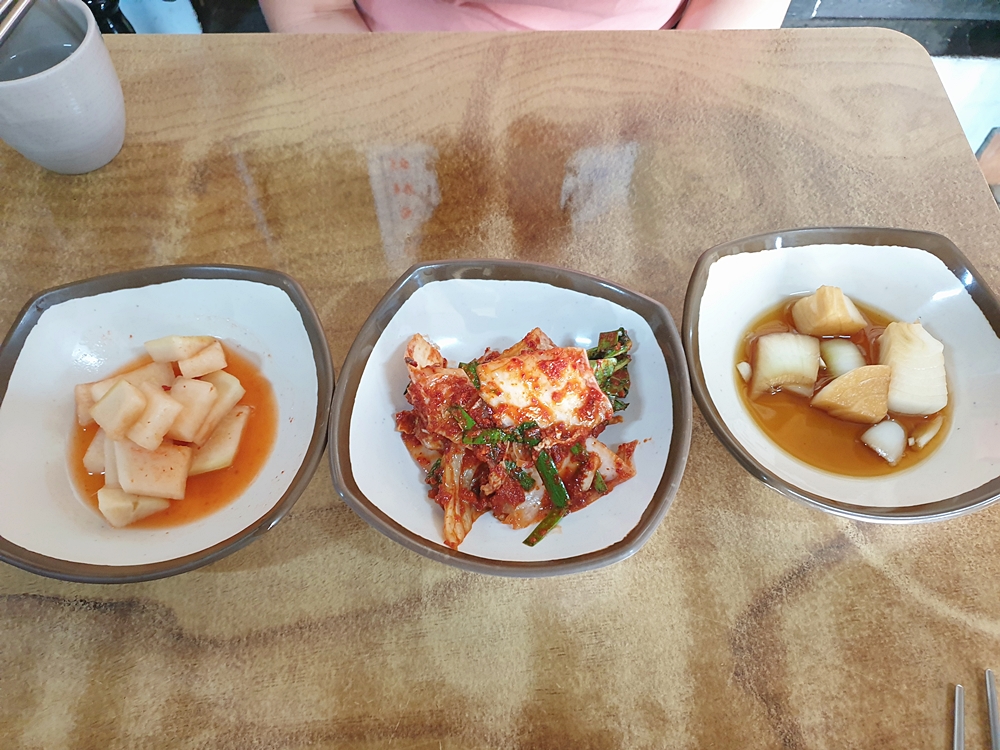 저희는 콩국수를 주문했는데요. 잠시 기다리고 있으니 반찬이 채워졌는데요. 반찬은 김치, 깍두기, 양파장아찌가 나와주더라고요.