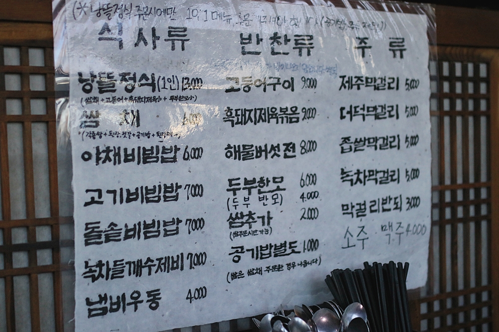 자리를 잡고 메뉴판을 확인해봤는데요. 모든 메인들이 들어가 있는 낭뜰정식부터 가성비 좋은 메뉴들이 가득 했는데요. 대부분 식사메뉴는 6~7천원 사이라 착한 가격으로 한끼를 해결하기에 좋답니다.
