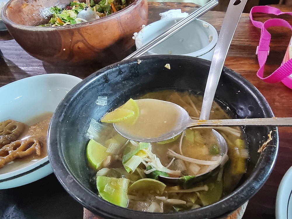 그리고 제주 낭뜰에쉼파에서는 따로 된장찌개도 내주시는데요. 구수한 된장찌개는 비빔밥에 넣어 함께 비벼 먹어도 좋고 그냥 먹어줘도 맛있는데요. 화려한 재료가 들어간것도 아닌데 적당한 구수함과 감칠맛은 정말 좋았네요.