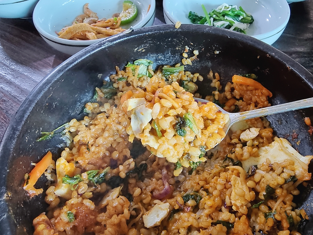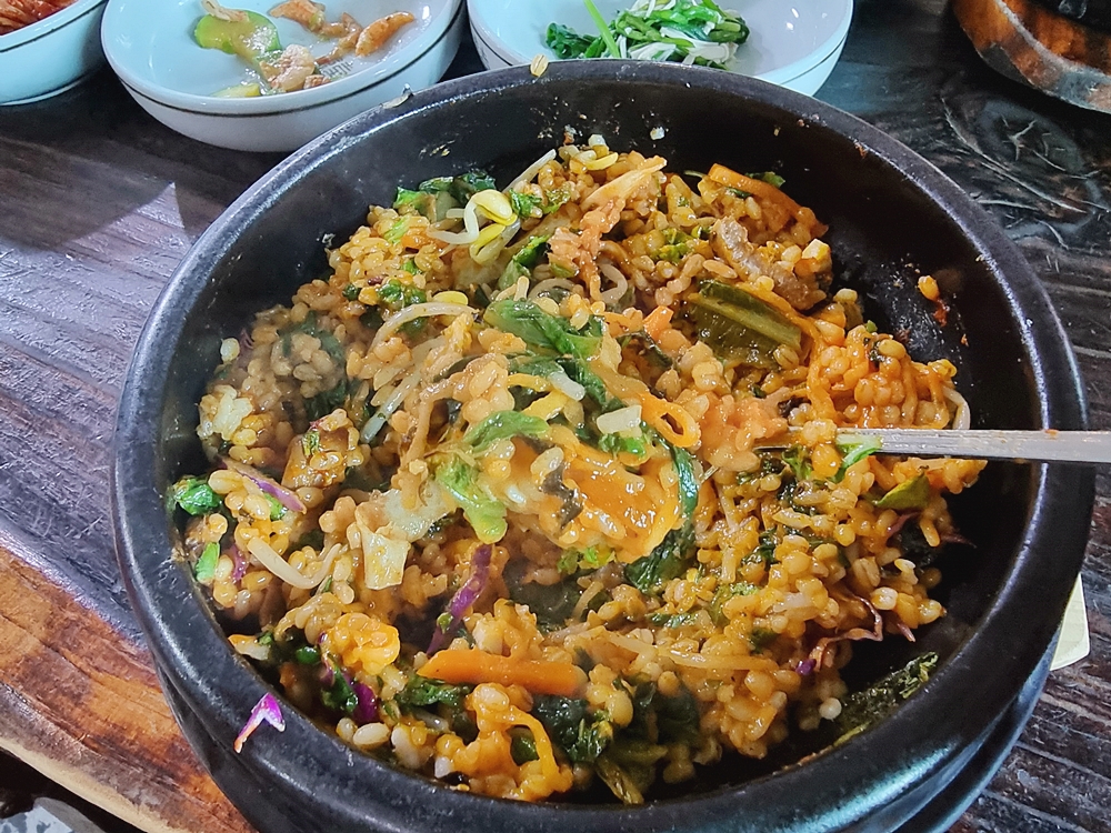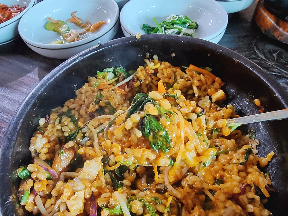 잘 비벼준 비빔밥은 고추장을 중심으로 모든 재료들이 하나가된 느낌이었는데요. 그리고 보리밥이라 쌀밥과는 식감부터가 다르더라고요.