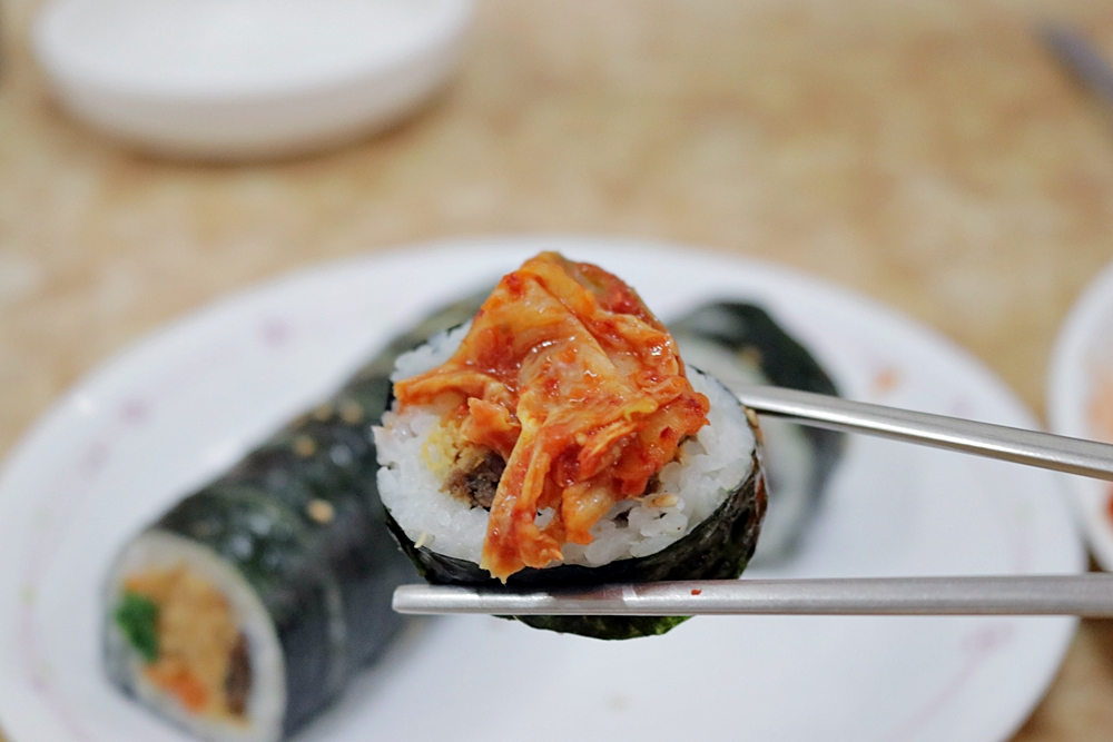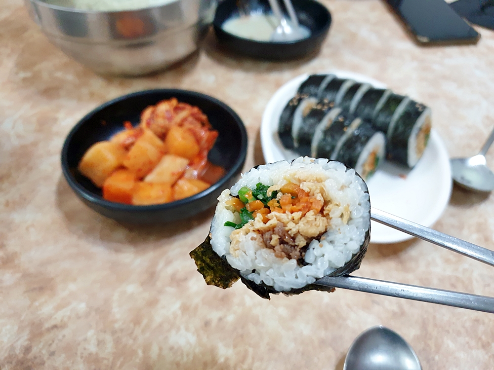 김밥 안에는 유부, 당근, 시금치, 소고기볶음이 들어간게 전부지만 식감부터 적당한 간이 자꾸만 손이 가게 하는 중독성 강한 맛이랍니다.