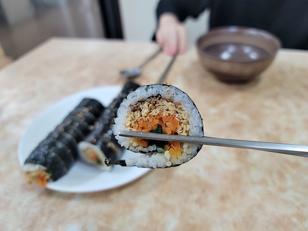 워낙 간도 적당하고 예술적인 맛인데요. 단무지나 햄이 들어가지 않아 훨신 건강함도 느낄 수 있는 김밥이랍니다.