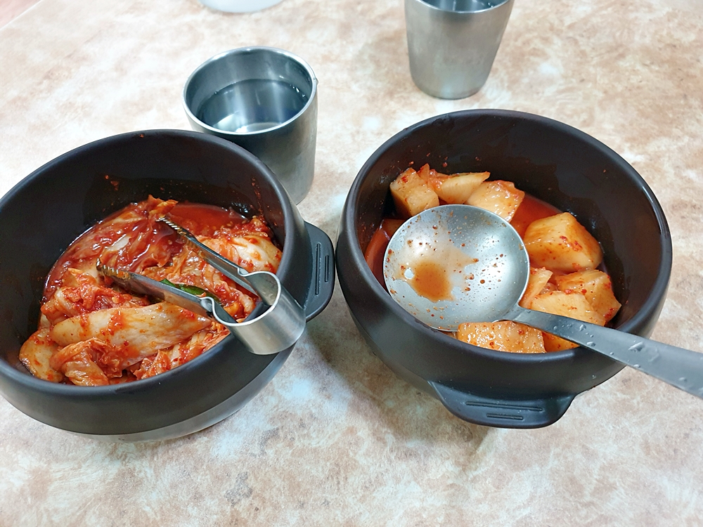 자리를 잡으면 테이블 위에는 단지 안에 반찬으로 나올 김치와 깍두기가 놓여 있는데요. 따로 앞접시를 주시니 먹을만큼 덜어서 드시면 된답니다.