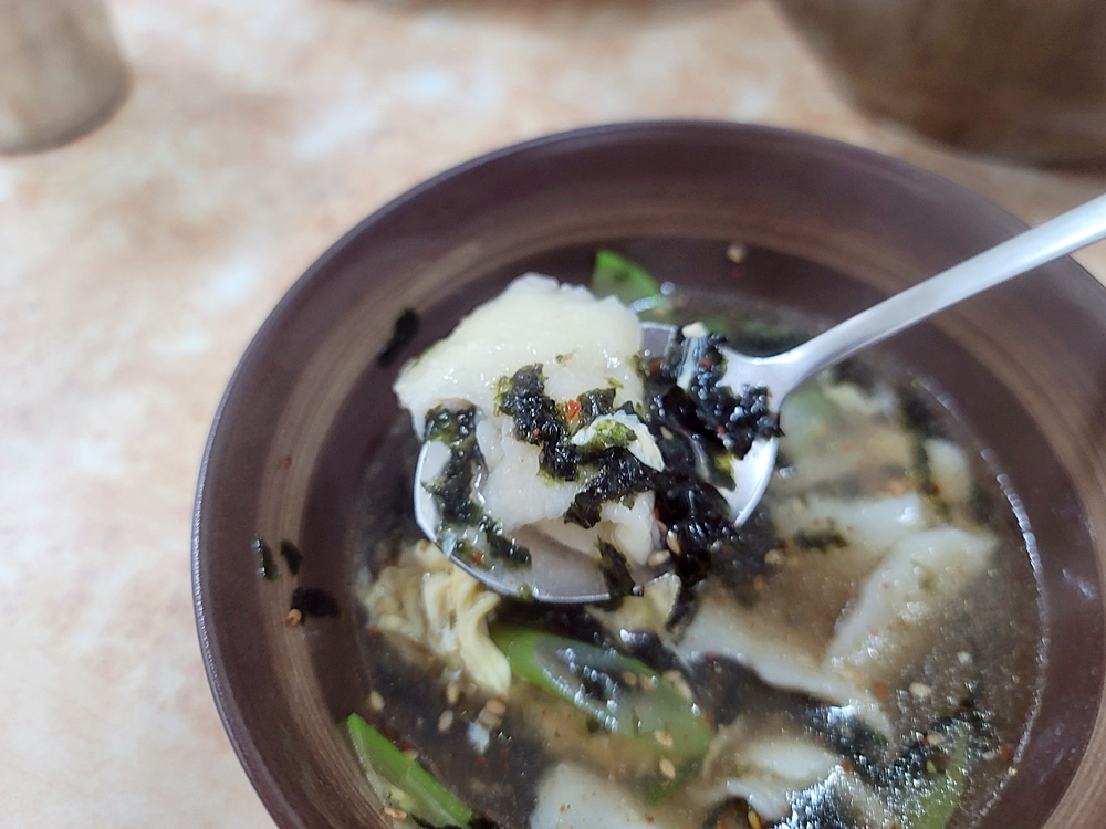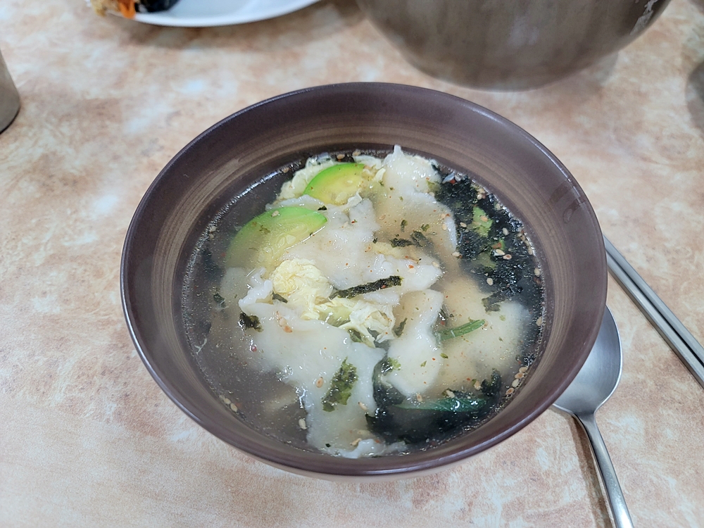 처음 등장은 큰 그릇에 담겨 나오기 때문에 앞접시에 덜어서 드시면 되는데요. 들어간거라곤 김가루, 계란, 파, 감자, 애호박 소박한것들뿐이지만 맛은 정말 위대하답니다.