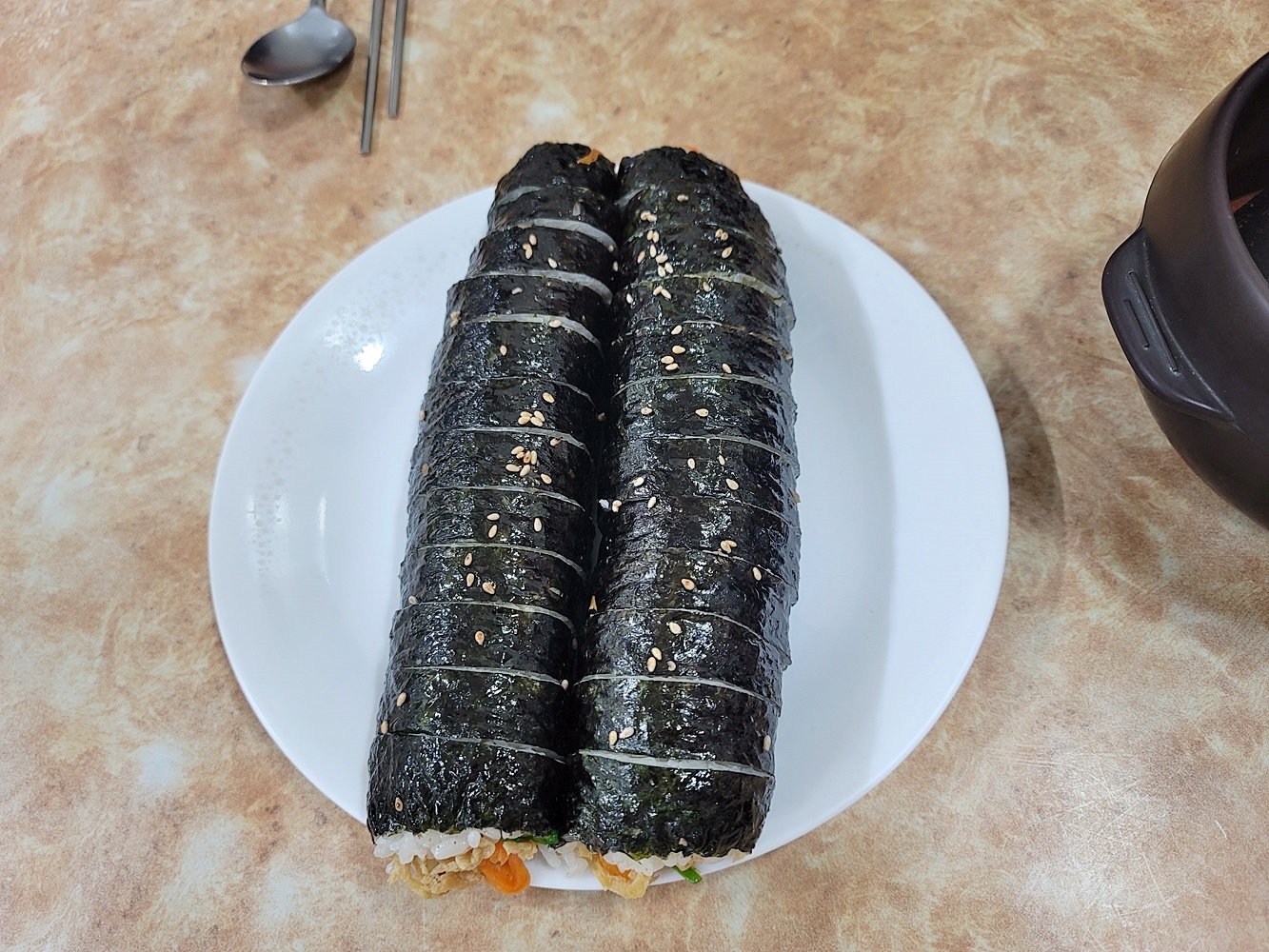 먼저 주문한 김밥이 나왔는데요. 이곳의 김밥은 김밥에서 빼놓을 수 없는 단무지와 햄이 들어가진 않지만 들어가지 않았다는걸 느끼지 못할만큼 매력적인 김밥맛을 선사하는 곳이랍니다.