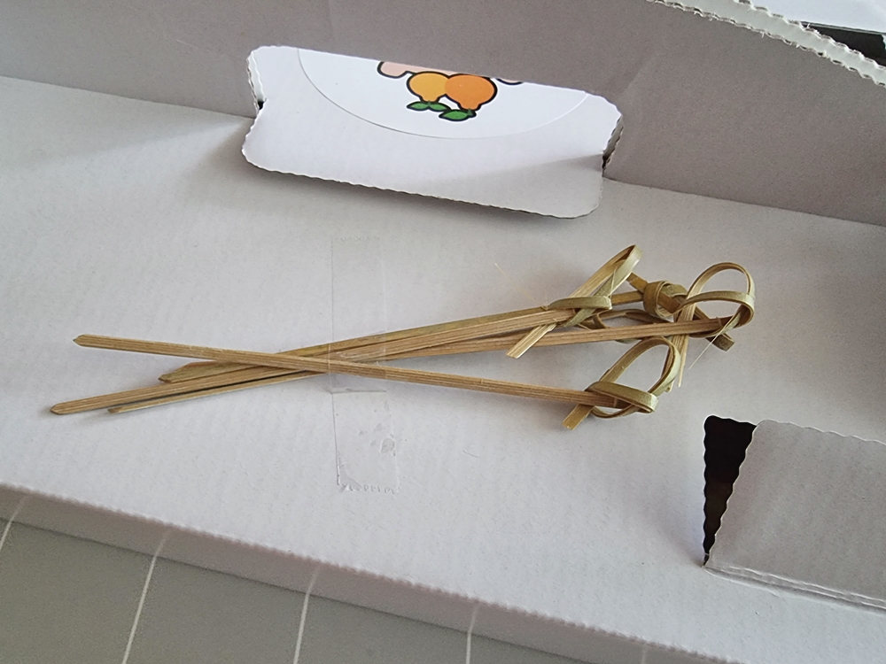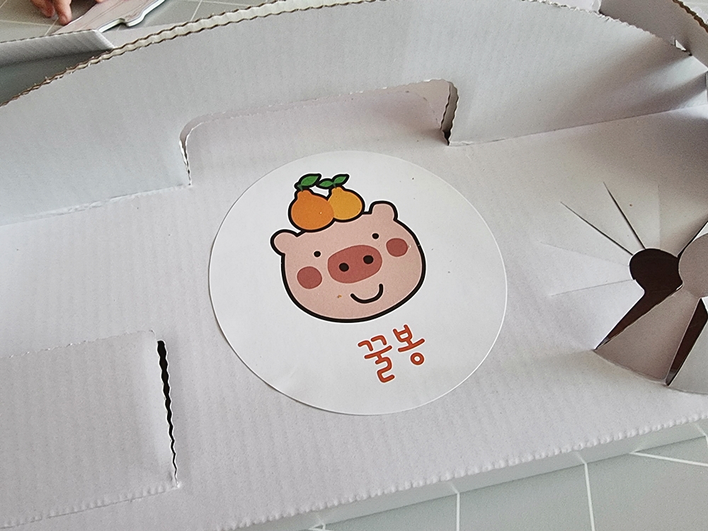 돼지강정은 하얀 종이박스에 포장이 되어 있었고 꿀봉의 캐릭터인 돼지 스티커가 붙어 있고 강정을 찍어 먹을 수 있는 꼬치가 함께하고 있었네요.