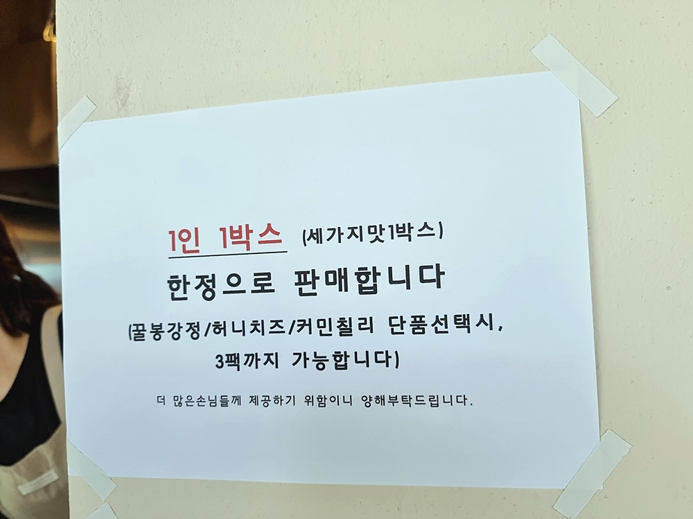 돼지강정은 꿀봉, 허니치즈, 커민칠리 이렇게 3가지맛이 준비되어 있었고 각가 단품으로도 구매가 가능하지만 한박스에 3가지맛 모두를 구매할수도 있었는데요. 1인 1박스 한정 판매를 하고 있으니 이점은 참고하세요.