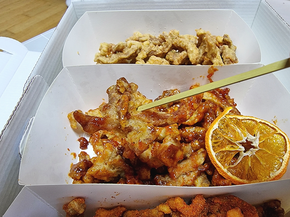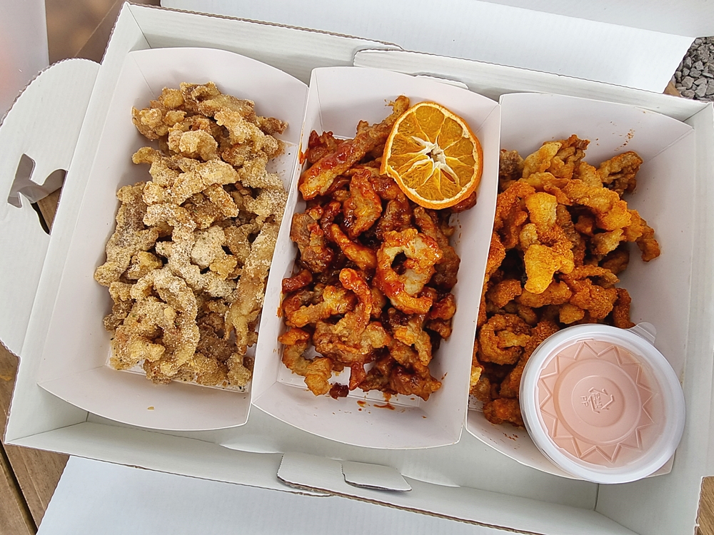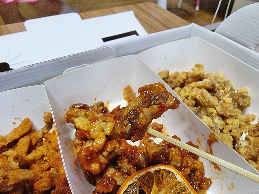 저희는 이동간에 단품으로 주문한 돼지강정을 먹었는데요. 온기가 있는 상태여서 그런지 겉은 바삭하고 튀김옷 안에 있는 돼지고기의 질감은 부드럽고 촉촉했답니다. 그리고 3가지맛이 함께하고 있어 물리지 않고 먹을 수 있다는 장점도 있었네요.