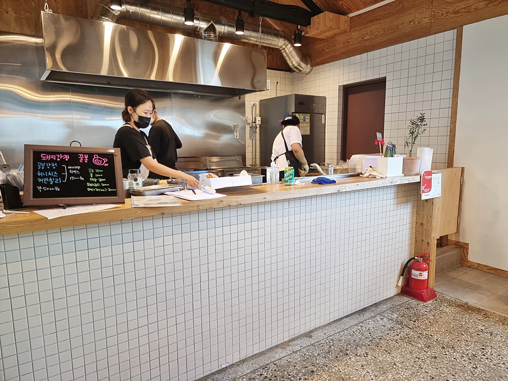 어짜피 기다려야 하는 시간이 길다보니 주변을 둘러봤는데요. 가장먼저 가게 안으로 들어가봤는데 방송에 나왔던분들이 조리를 하고 계시더라고요. 오픈형 주방이기 때문에 돼지강정을 튀기고 양념을 입히는 과정을 눈으로 확인할 수 있어 왠지 믿음이 갔답니다.