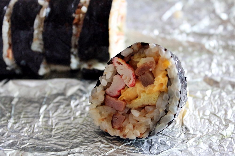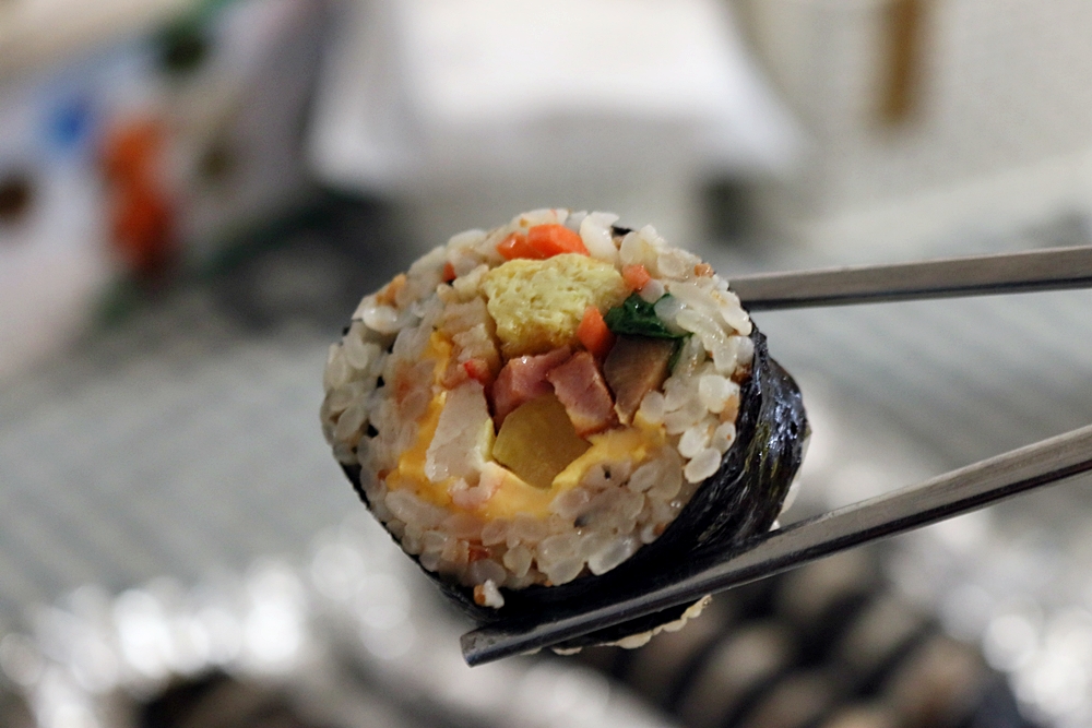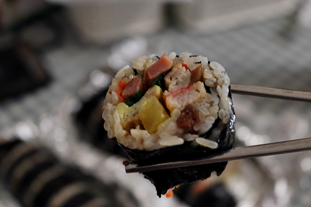 김밥을 자세히 보면 안에 들어간 재료들은 그리 화려한 재료들은 아닌데요. 하지만 밥과 함께 섞여 있는 튀긴 무언가가 중독성 강한 맛을 선사한답니다.