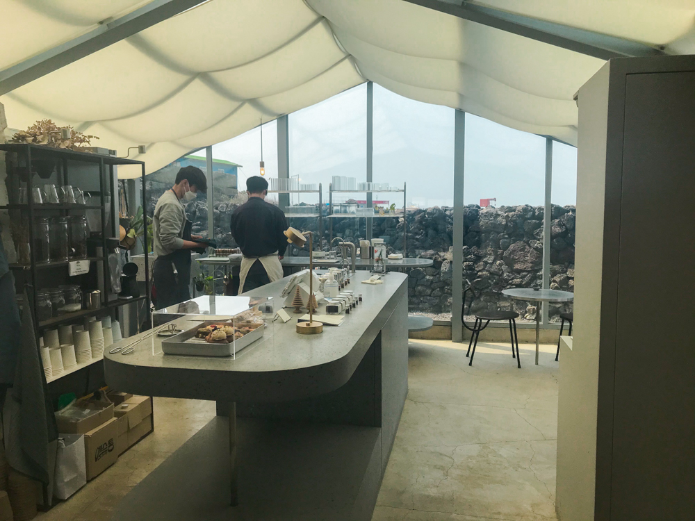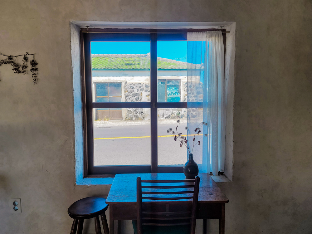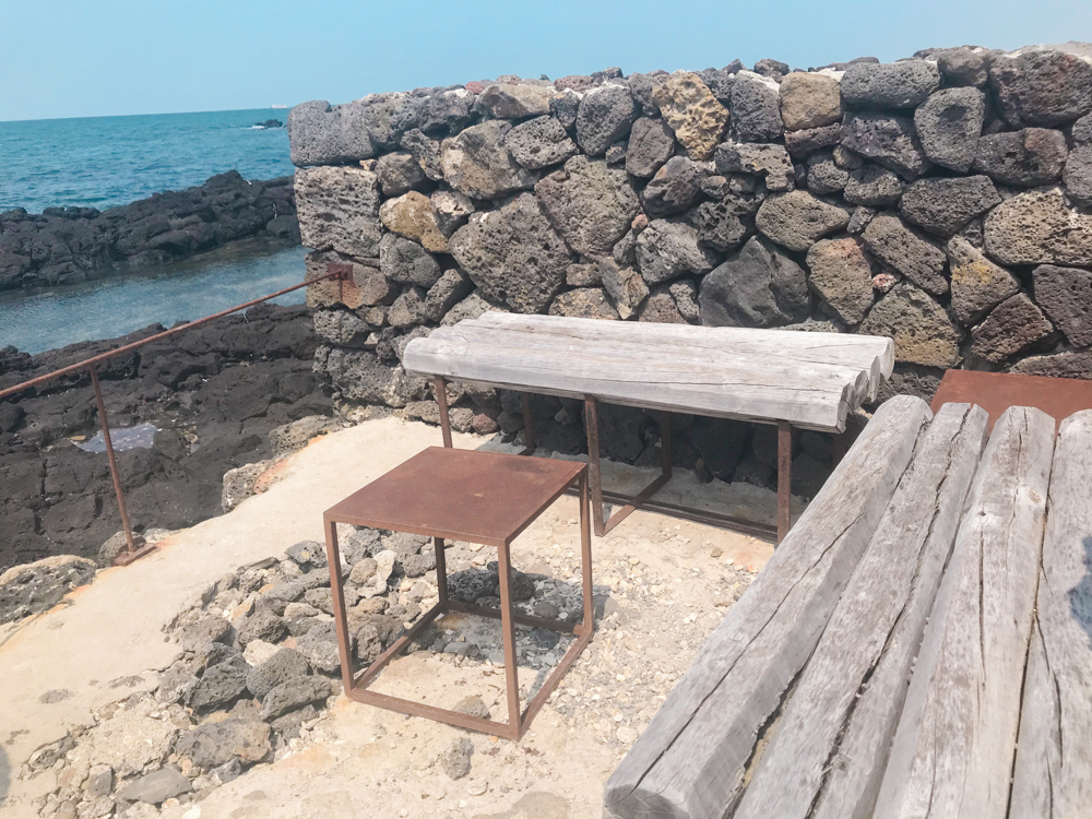 거기다 야외에는 예전 제주의 집터에 있는 수돗가 등을 활용해 만든 테이블로 되어 있는데요. 특히 바닷가쪽으로는 바로 앞 바다를 바라보며 커피 한잔을 할 수 있도록 되어 있어 사진찍기에도 좋답니다.