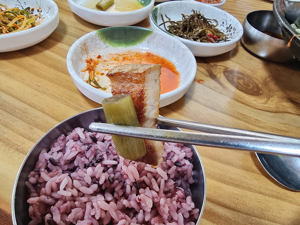 쌈채소에 푸짐하게 밥과 바찬 그리고 고기를 쌓아둔후에 한입에 넣어 먹어주니 식감부터 맛이 풍성해지는걸 느낄 수 있었네요.