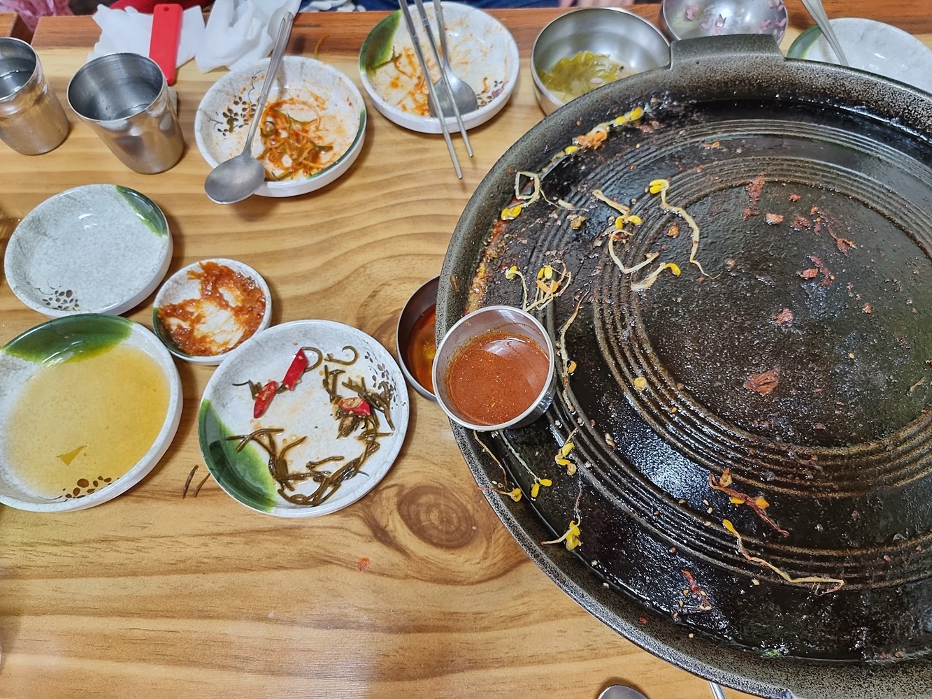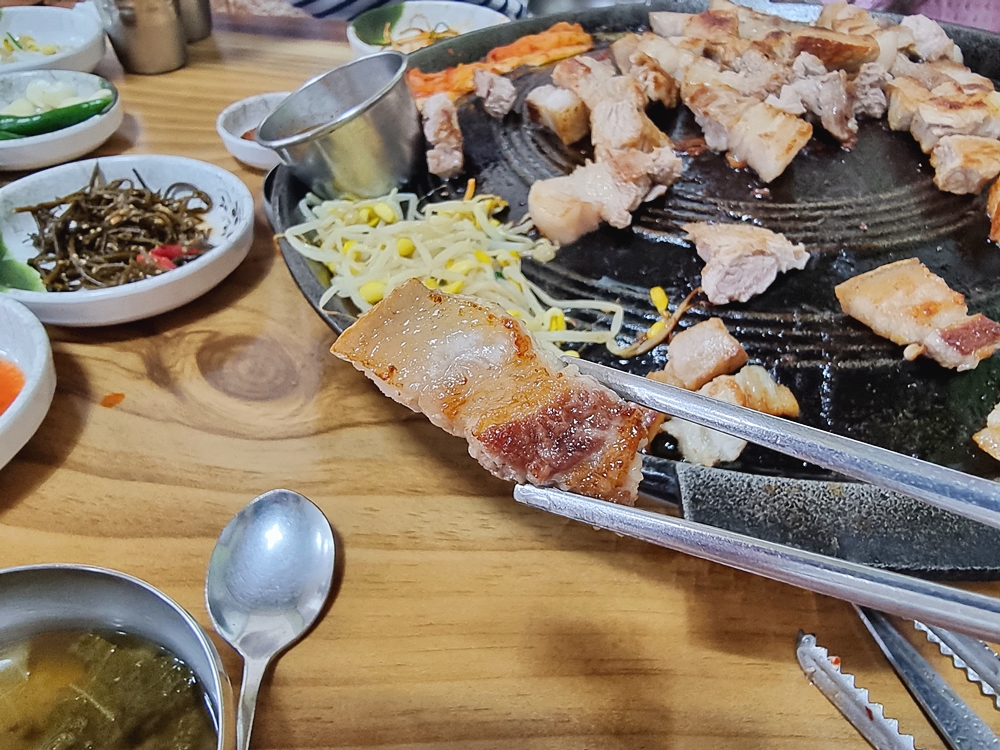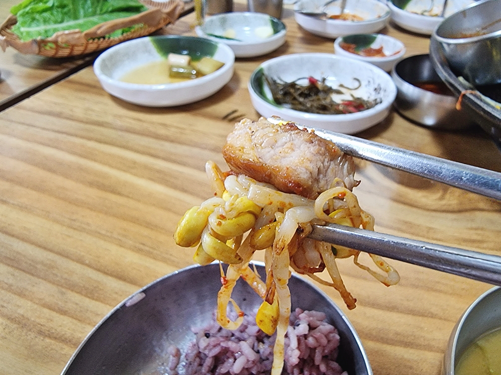 솥뚜껑에서 구워낸 고기 그리고 김치와 콩나물의 콜라보는 정말 환상적이었는데요. 이 가격에 이렇게 먹을 수 있다는게 절말 감사했답니다.