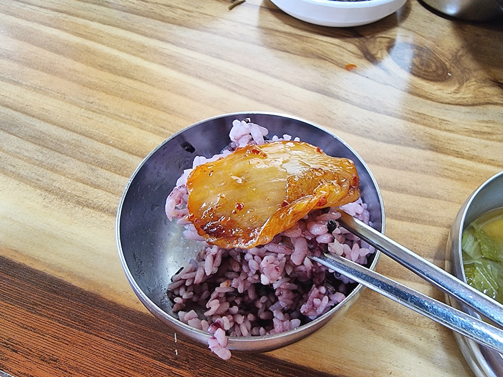 한아름식당의 포인트는 솥뚜껑 위에서 고기와 함께 구워낸 김치인데요. 김치가 노릇하게 익을때쯤 밥위에 올려 먹어주니 밥도둑이 따로 없었네요.