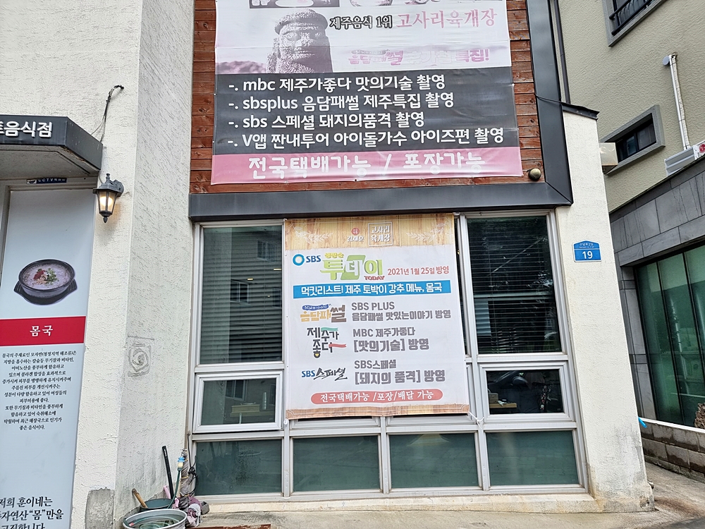 입구에는 TV에 나왔었던 흔적의 현수막들이 걸려 있었는데요. 특히 짠내투어에서 제주 향토음식중 고사리육개장을 먹으러 갔던 곳으로 꽤나 유명한 곳이랍니다.